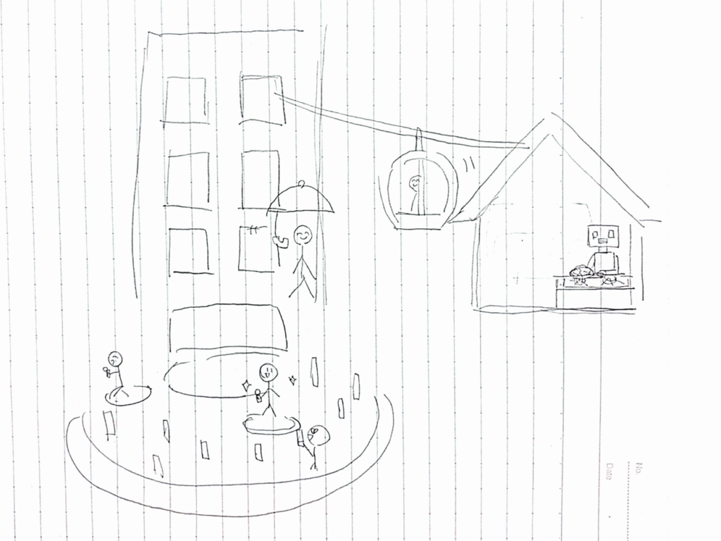 「ちょっと絵に描いてみてよ」とお願いすると、エミリさんはペンを走らせ、空を舞うドローン傘やホログラムステージを楽しそうに描き込みました。出来上がった絵はまさに“便利で生きやすい未来の暮らし”そのものです。