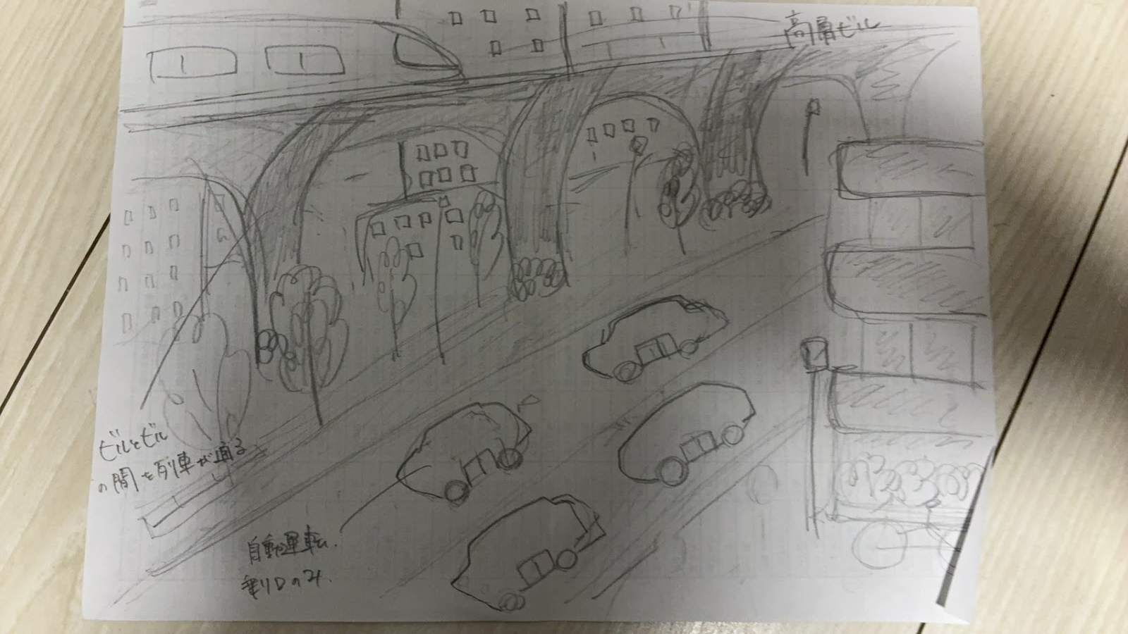 Yくんは、街の風景を描いてくれました。絵では空飛ぶ車ではなく、自動運転が普及した未来を描いてくれました 。多くの人が都市に移り住み、ビルが増える社会を予想しているようです 。彼の絵からは、SF映画のような非現実的な未来ではなく、現在の技術の延長線上にあり、より便利になった都市の姿が見て取れますね。